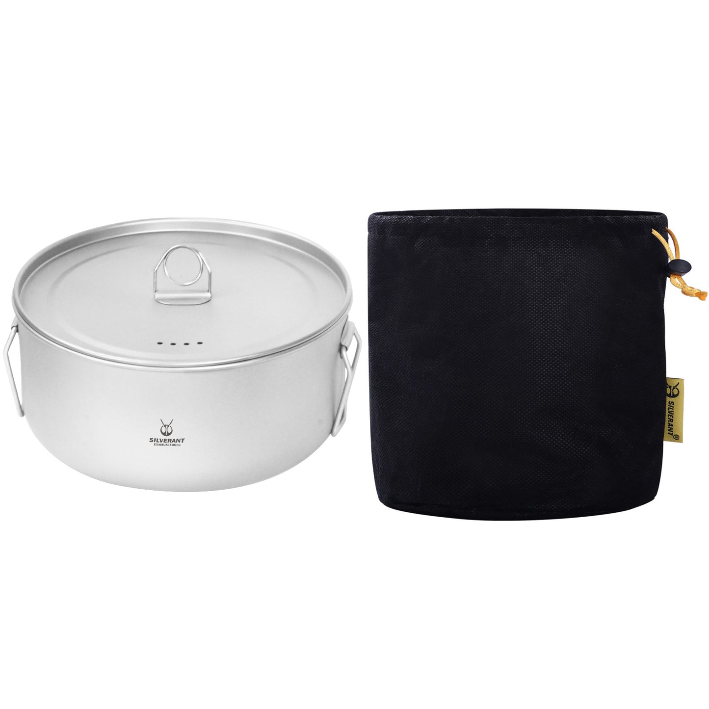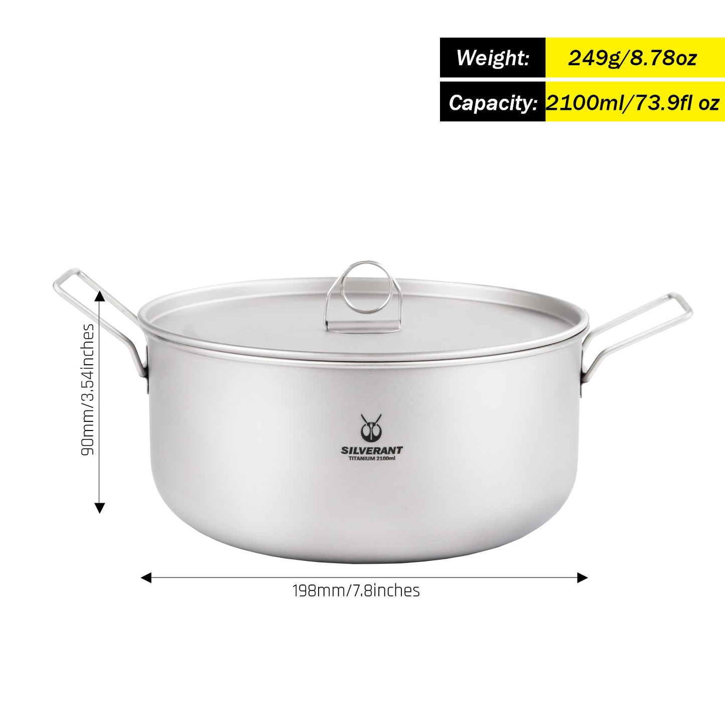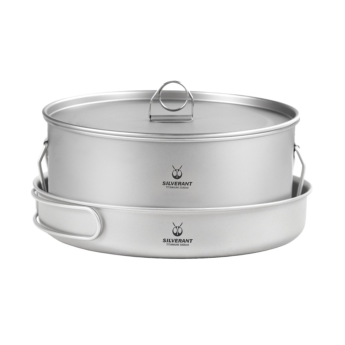 The SilverAnt large titanium camping cookware pot weighs 249g/8.78 ounces with a capacity of 2100ml/73.9 fl oz. The titanium frying pan weighs 145g/5.11 ounces with a capacity of 1000ml/35.2 fl oz. Together the large 2-piece camping ware set weighs 394g/13.89 ounces(Buy together or separately). Both are strong, durable, and lightweight, built for a lifetime of campfire cooking.