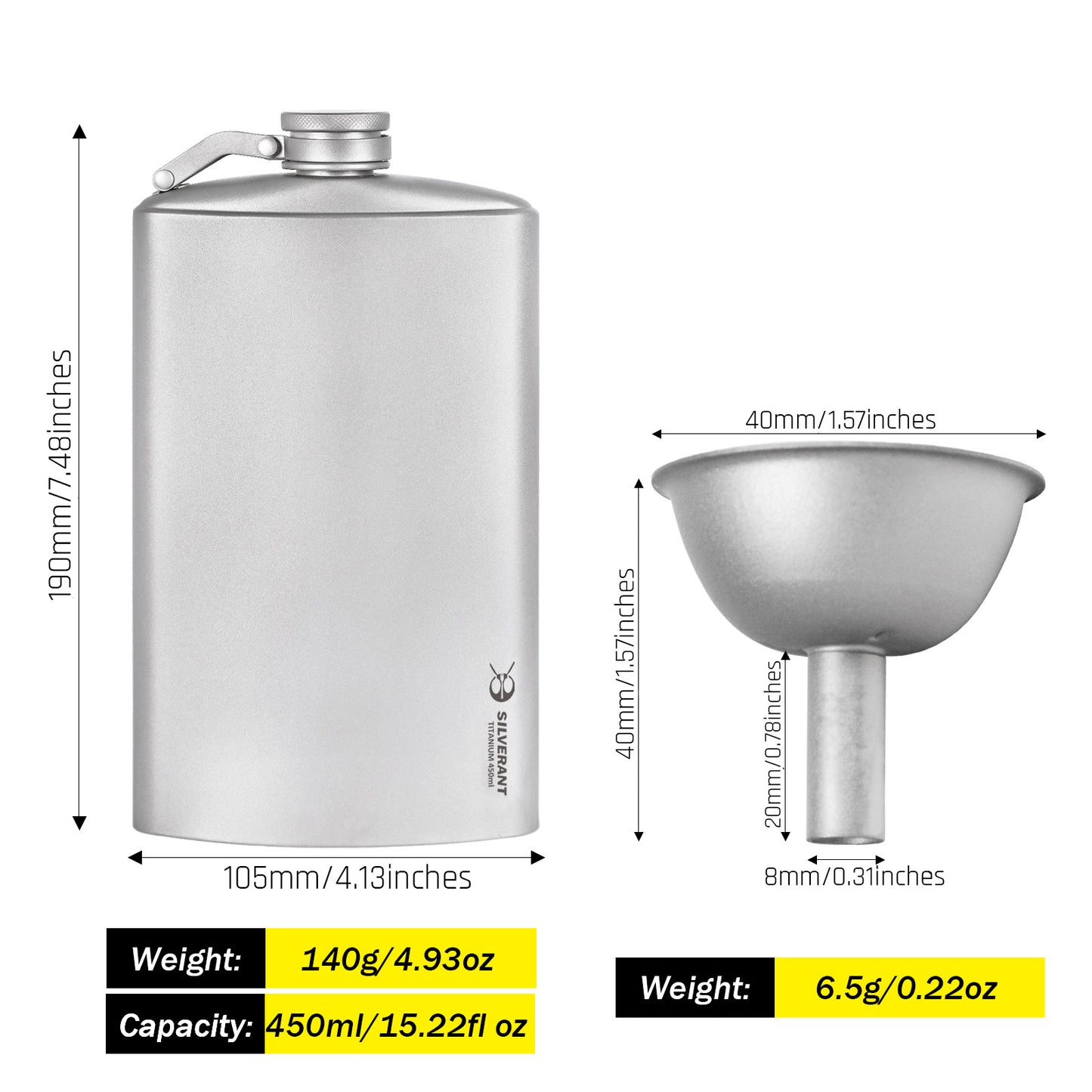 If you prefer a larger capacity for more of your favorite drink, the SilverAnt Large Titanium Hip Flask (450ml/15.22 fl oz) weighs 140g/4.93 ounces without liquid, with dimensions of 105mm/4.13 inches (width) and 190mm/7.48 inches (height).