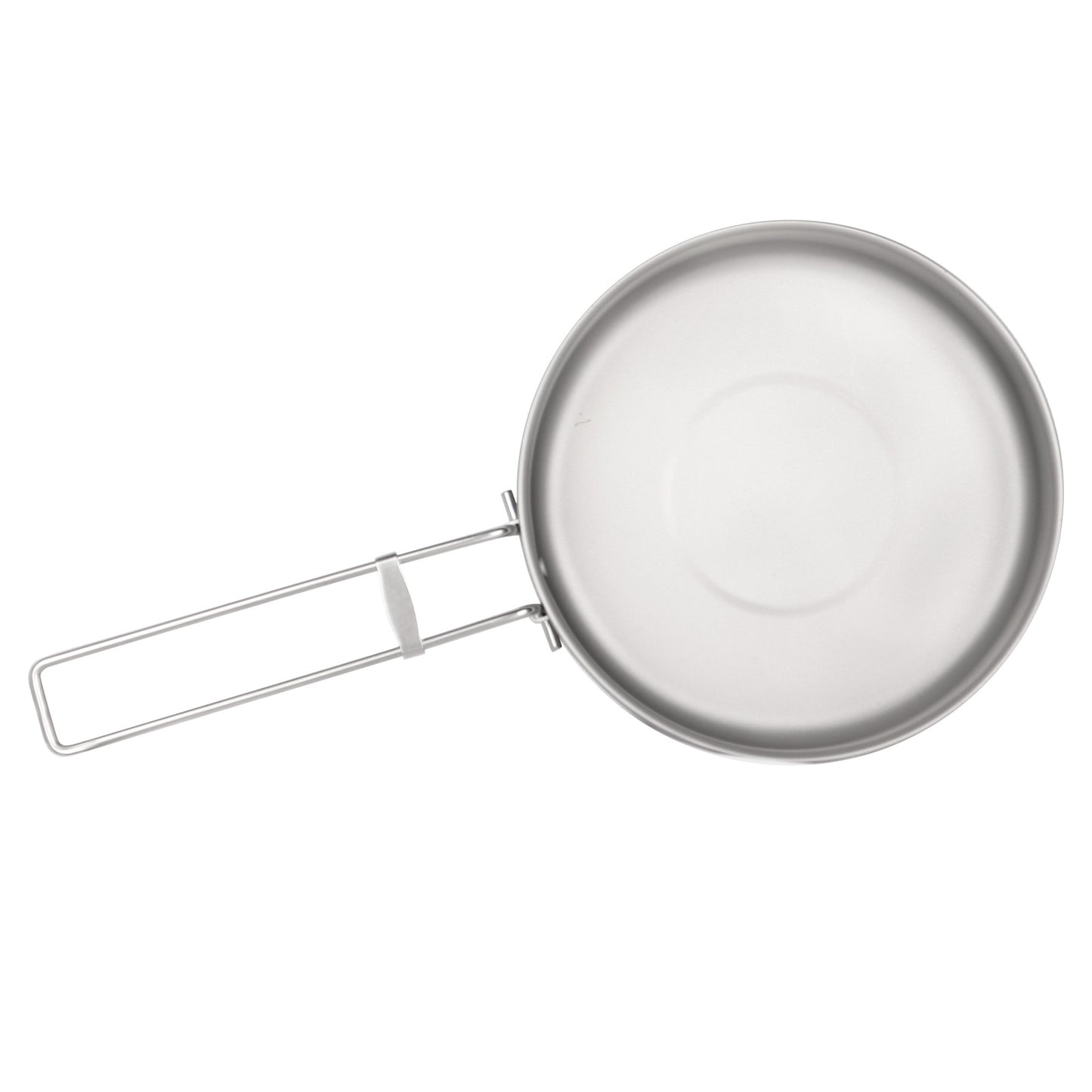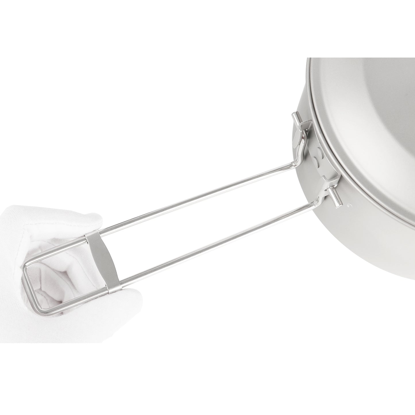 Building upon our previous titanium camping cookware set we included a handle stability slider. This makes the titanium pot and pan stable and easier to hold/carry during camp cooking. Lock the slider into position when cooking and when storing slide and fold the handles.