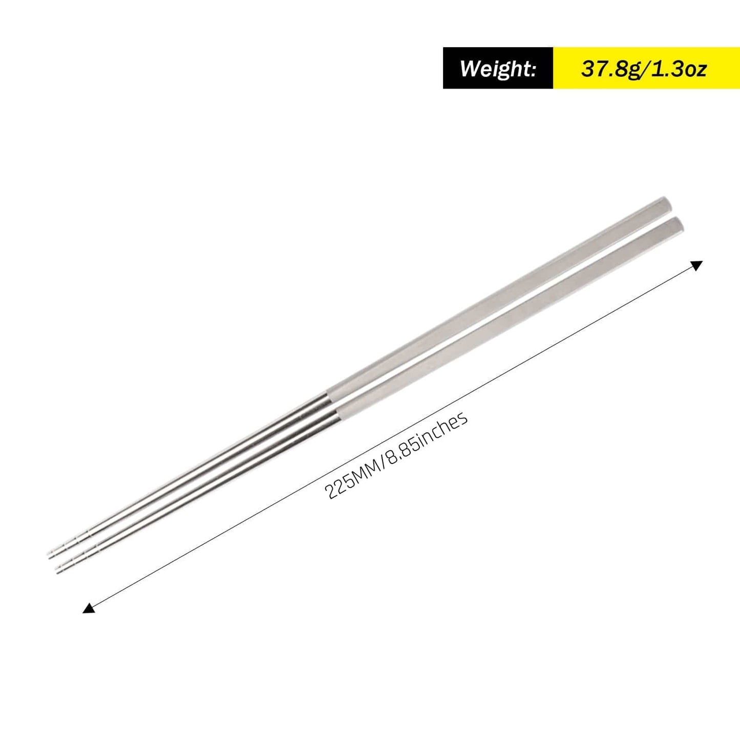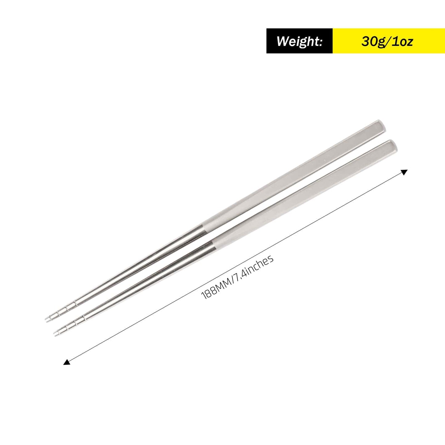 SilverAnt produces two sizes of titanium chopsticks. Choose between the long handle set at 225mm/8.85 inches long or the short handle set at 188mm/7.4 inches long. Both weigh 37.8g and 30g respectively. Feel the difference between holding a perfectly balanced set of titanium chopsticks made entirely from solid titanium. Each chopstick set comes with a drawstring bag for convenient storage.
